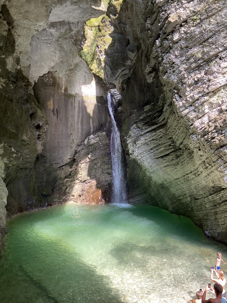 After visiting a waterfall, we dipped our toes into the icy blue river before some rumbling thunder threatened a down pour. Thankfully, we made it back to our car just as the storm was beginning. After driving through the mountains in torrential rain, we arrived in the Slovenian ski town of Bovec. We enjoyed cool mountain air and fresh sunshine while munching on hamburgers and chatting with a German family. After several hours without food, it was one of the best meals I’ve ever had!
